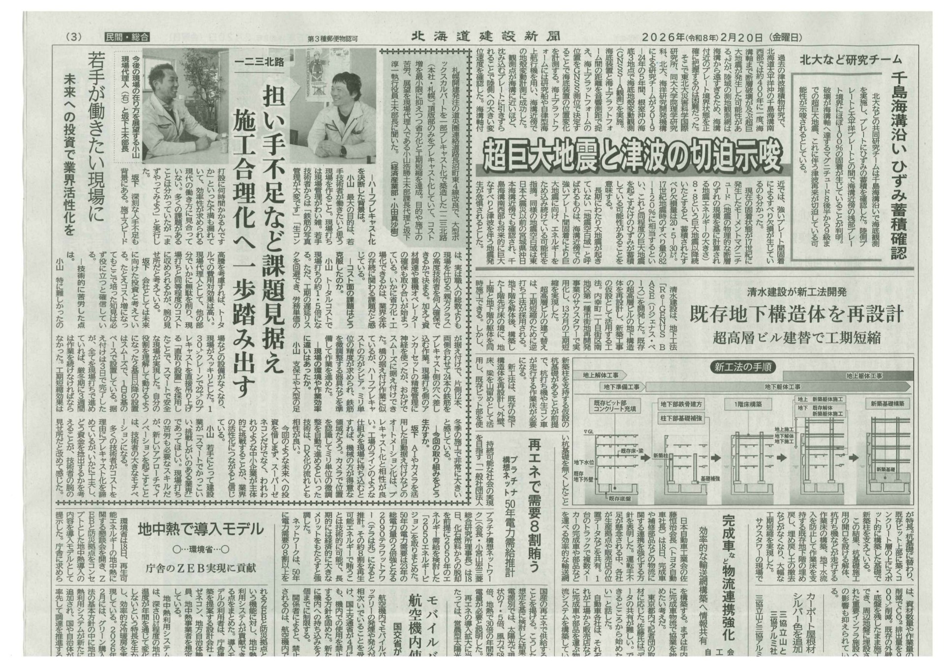 建設新聞特集記事 担い手不足による施工合理化?! | 北海道建設新聞(2026.2.20)【記事を見る】 |